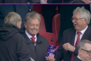 体育资讯10月20日讯 曼联vs利物浦下半场,镜头给到看台上,弗格森在看台上分享巧克力给达格利什,此时比分曼联1-0领先!