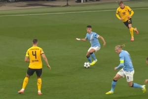 福登弧顶接球低射,皮球直挂死角破门,曼城1-0领先多特