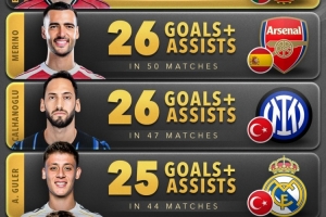 2025年中场参与进球榜:B费28球居首,梅里诺、恰尔汗奥卢26球