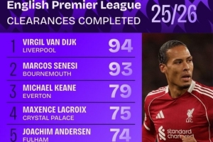 本赛季英超解围榜:范戴克压塞内西居首,基恩、拉克鲁瓦在列