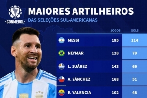 体育资讯11月13日讯 德国转会市场列出了南美各国家队的历史射手王,梅西、内马尔、苏亚雷斯、桑切斯在列。