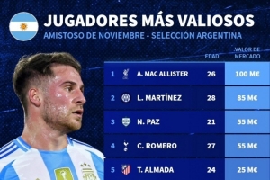 本期阿根廷队身价榜:麦卡利斯特1亿欧居首,梅西1800万欧第9