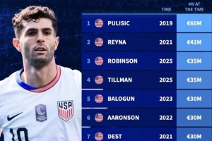 德转美国球员最高身价排名:2019年普利西奇6000万欧元居首