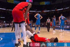 第一场强度就这么大阿门防守后直接抽筋了 在场边拉伸放松