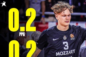 体育资讯11月17日讯 明年的热门新秀穆里宁截止目前为止,在欧篮联只出场4次,场均出场时间仅为1分55秒,而他的场均数据可以忽略不计,4场比赛合计就得到1分,场均为0.25分,也没有篮板、助攻进账。