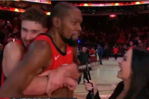 都是功臣!杜兰特接受采访时 申京跳着跑过来拥抱庆祝