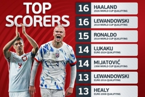 欧足联列单届世欧预/欧预赛进球榜:哈兰德、莱万16球居首