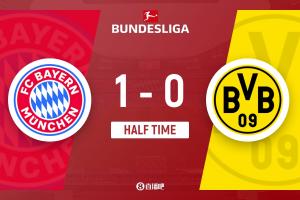 半场-拜仁暂1-0多特 凯恩破门+7轮12球基米希助攻多特零射门