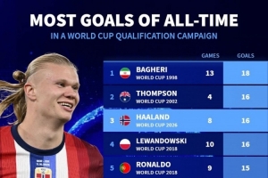 世预赛历史单届进球榜:哈兰德、莱万16球第二,C罗15球第五