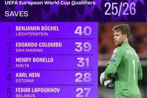 世欧预扑救榜:列支敦士登门将布歇尔40次居首 圣马力诺门将第二