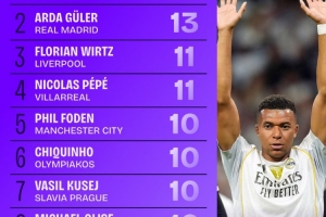 欧冠创造机会排行榜:姆巴佩16次排第1、居莱尔第2、维尔茨第3