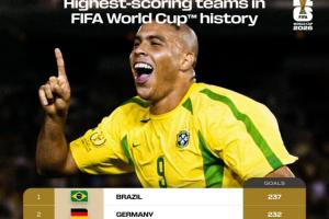 巴德断档前二!世界杯球队总进球榜:巴西237球居首 德国232球第2