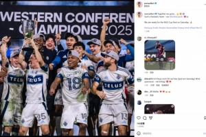 穆勒社媒晒出了与队友庆祝夺得分区冠军奖杯的合照,配文写道:“我们一起进步!温哥华白浪是如此棒的一支球队,我们已经为周六的总决赛做好了准备!”
