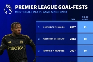 富勒姆vs曼城出现9粒进球,英超历史单场比赛进球第7多