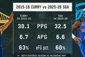 很接近!73胜赛季库里场均30.1分6.7助 本赛季SGA场均32.5分6.6助