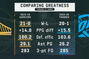 历史级别!73胜勇士与本赛季雷霆前21场对比 后者三分&净胜分更佳
