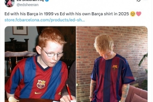 体育资讯10月24日讯 英国创作歌手艾德-希兰更新社媒,晒出自己在1999年和2025年身穿巴萨球衣的照片。