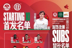 2025华润饮料中超联赛第28轮 河南VS浙江 首发及替补队员名单