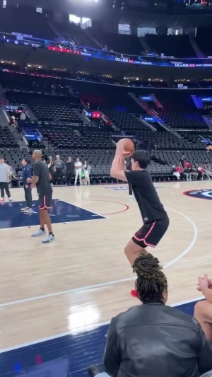 今天能进首个三分吗?杨瀚森热身三分训练手感柔和只投丢一个